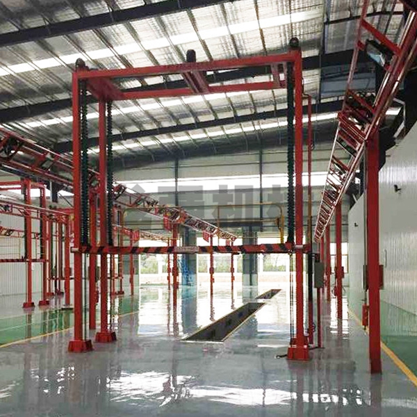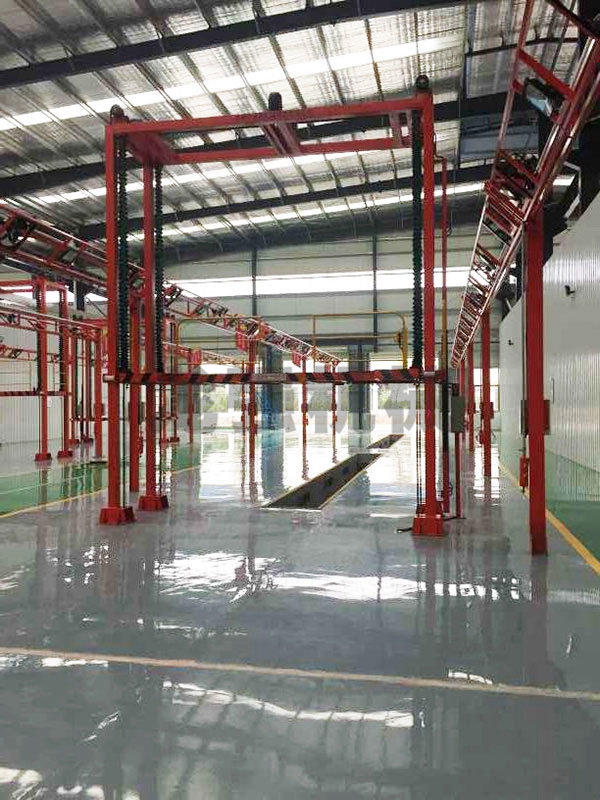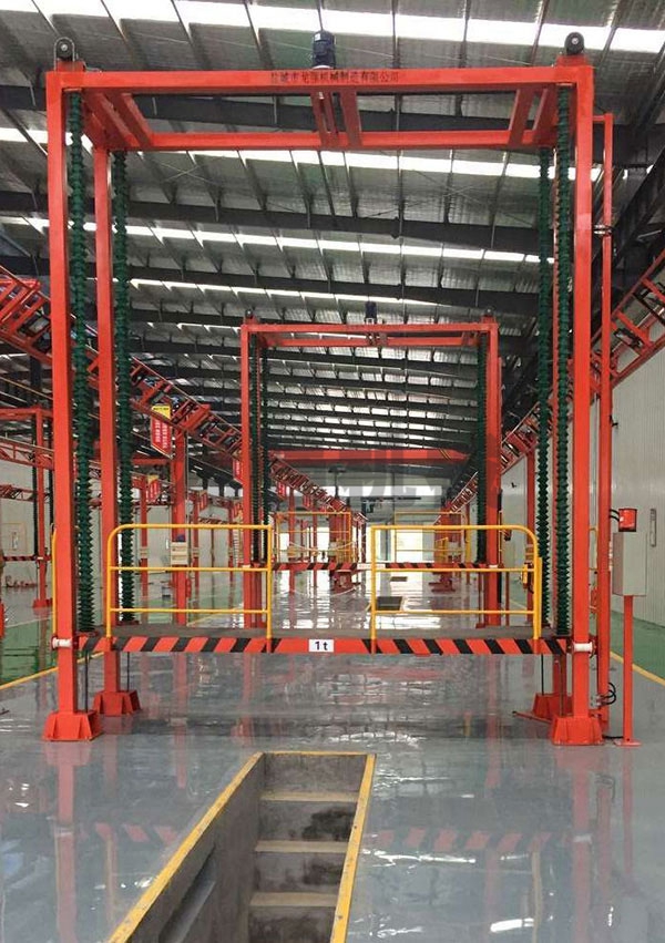 本設備系采用制動電機連接減速機減速后,通過主軸及鏈輪、鏈條的機械傳動方式改變運動方式,以導向柱導向輪等組成的導向機構(gòu),操作平臺升降過程的相對穩(wěn)定和整機剛性,在邊立柱的鏈條一端加配重錘,以減少電機工作負荷,減少振動幅度,以達到平臺升降平穩(wěn)的目的,并采用鋼絲繩保險裝置,鋼絲繩兩端分別與平臺及配重錘連接。當鏈條發(fā)生斷裂時,因鋼絲繩與平臺配重錘連接不至于平臺突然下墜,以是的操作人員能及時調(diào)整平臺,從而使得操作人員的人身保障。